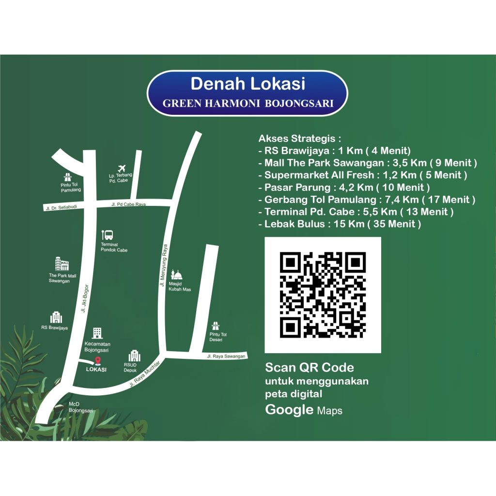 Miliki rumah impianmu bersama kami di Green Harmoni Bojongsari dengan kemudahan akses dan keuntungan maksimal. Berada di Ring I kampus PPG UIN Syarif Hidayatullah, hanya 500 meter ke Jalan Raya Ciputat Parung, akses ke Pintu Tol hanya 15 menit dan waktu tempuh ke Jakarta Selatan hanya 30 menit. Dilewati jalur Angkutan Kota 106 jurusan Lebak Bulus dan D-28 Jurusan Ciputat.